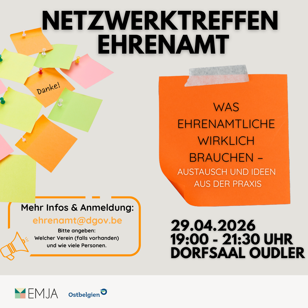 Was Ehrenamtliche wirklich brauchen – Austausch und Ideen aus der Praxis. Anmeldung unter ehrenamt@dgov.be
